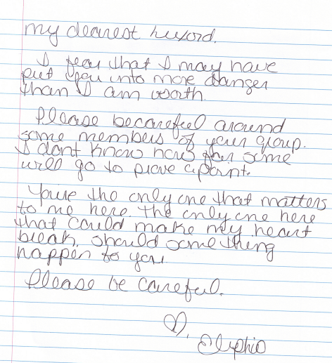 Elphie scribbles a note to Luxord and stuffs it in her pocket. After the threat on Luxords safety by one of his own, she felt she needed to warn him. She hurried out the room in search for him